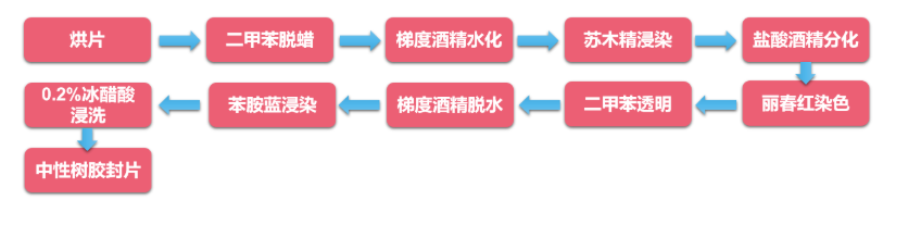 2. 苏木素染色:切片入苏木素染液8-10min→自来水洗→分化液分化→返蓝液返蓝→流水冲洗