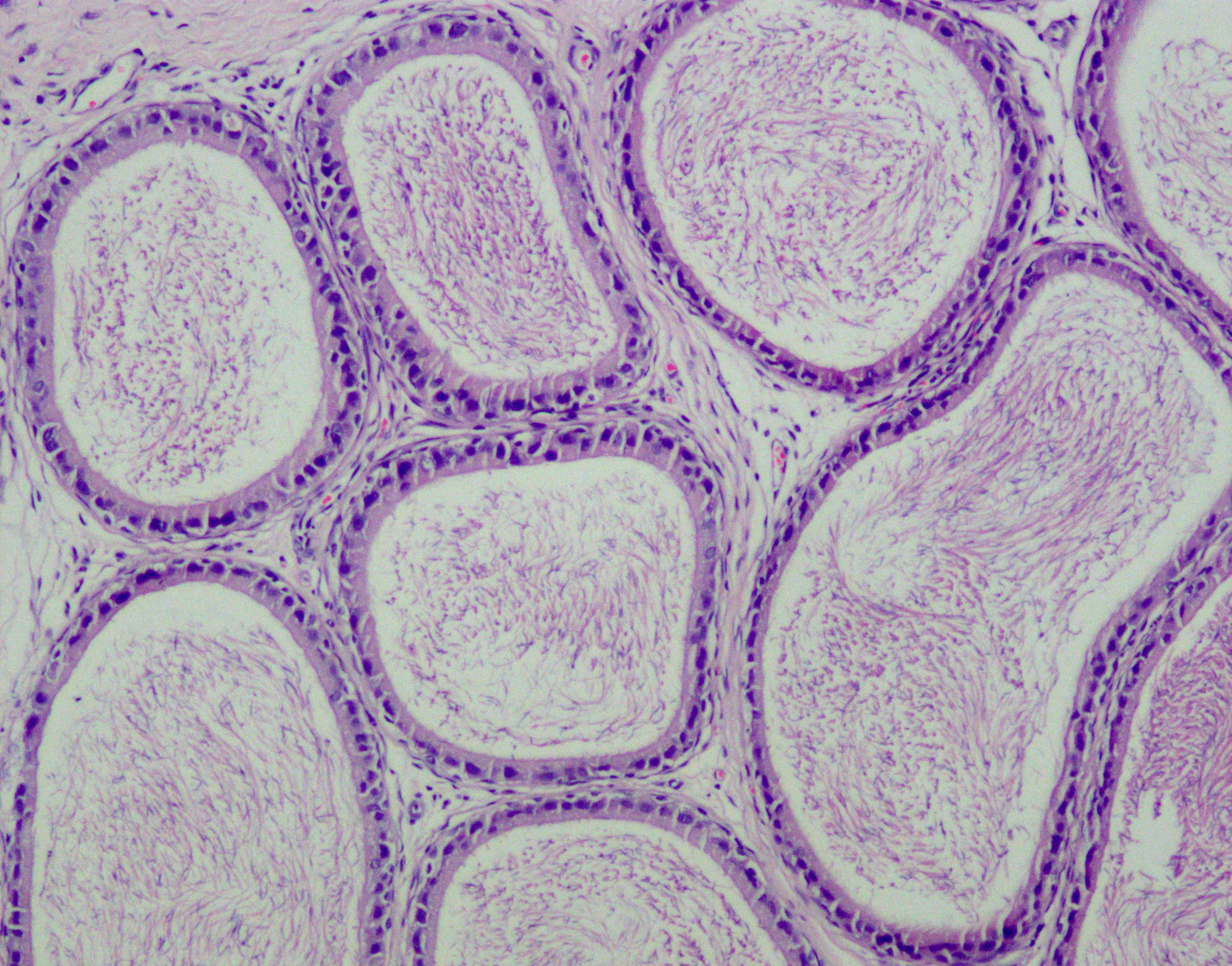 苏木精-伊红染色法(Hematoxylin-Eosin staining),简称HE染色法,是石蜡切片技术中最常用的染色方法。苏木精染液为碱性,主要使细胞核内的染色质与胞质内的核糖体着紫蓝色;伊红为酸性染料,主要使细胞质和细胞外基质中的成分着红色。HE染色法是组织学、胚胎学、病理学教学与科研中最基本、使用最广泛的技术方法。