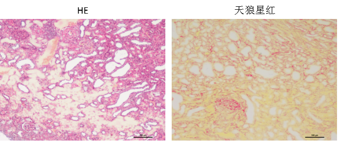 HE染色可以看出造模后肾皮质区域大量组织坏死、肾小球硬化、肾小管上皮细胞萎缩,管腔增大;天狼星红染色显示肾小球出现硬化,肾小管间可见呈现红色的胶原纤维沉积。